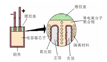 固态铝电容器的结构为:正箔和负箔分别与正、负导针相连,两者由隔离材料隔开并重迭卷绕在一起,并由胶带固定,其中,隔离材料为疏松多孔结构,其间填充有导电高分子聚合物;该卷绕结构被铝外壳和橡胶盖密封,导针穿过橡胶盖与外界相通。